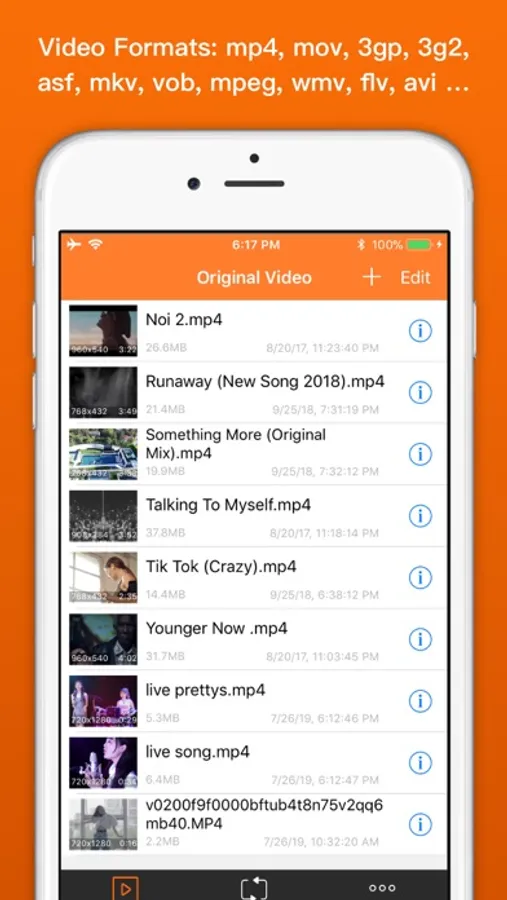 - Support video format: mp4, mov, 3gp, 3g2, asf, mkv, vob, mpeg, wmv, flv, avi …..