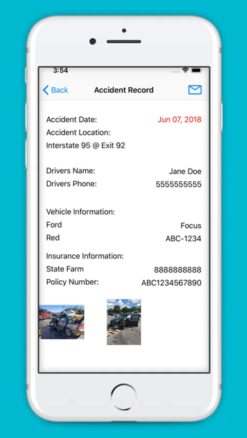Once your record is submitted, it is stored in the app locally on your device only and can be found on the main screen. Tap on any accident to review the information and view the photos that were taken, then tap on the email icon to send all of the information and photos to yourself or to your insurance company to help with filing your claim. All records will stay in the app until it is no longer needed and you swipe left and delete it. All info and photos will be removed from the app.