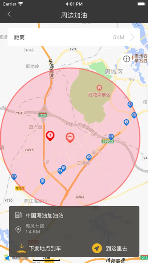 周边加油:可以查看行驶过程中的周边加油站,方便车主行车过程中的加油需求;