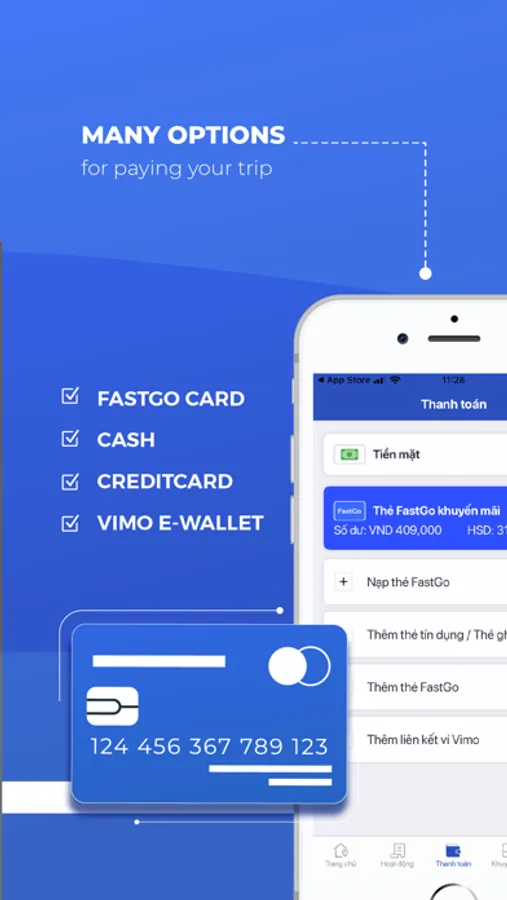 FastPay: The diversity of payment methods (cash, credit card, or e-wallet,….) and just with FASTGO card, you can pay all FASTGO service and accumulate Fast point for each time.