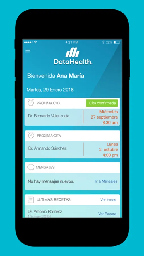 DataHealth Paciente te permite estar mejor conectado con tu médico! Agenda, confirma y cancela citas. Recibe una copia de tu receta, y próximamente mucho más!