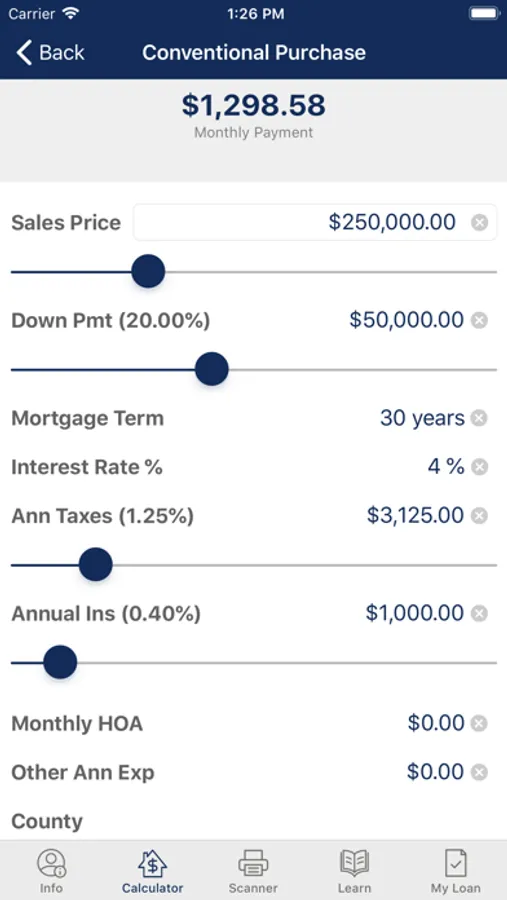 The calculations provided by the Highlands Residential Mortgage app are useful in giving you an idea of what homeownership or refinancing might mean for you. However, please be sure to contact your Highlands Residential Mortgage Loan Officer for a customized solution tailored to your specific financial situation, needs, and goals.