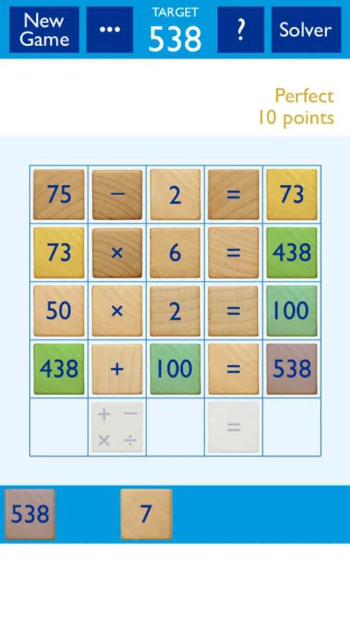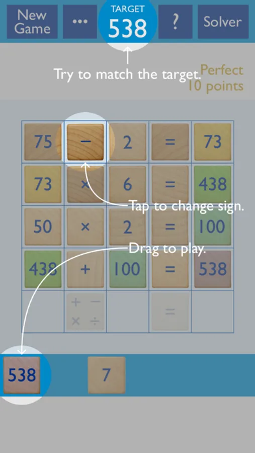 • Play the game by dragging numbered tiles onto the game board and progressively building up arithmetic expressions to a final result that matches the target number (or comes within ten of it).