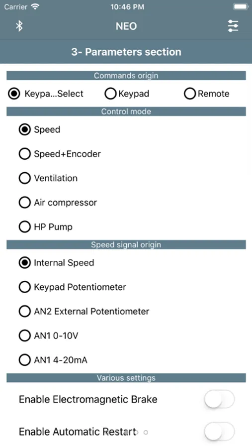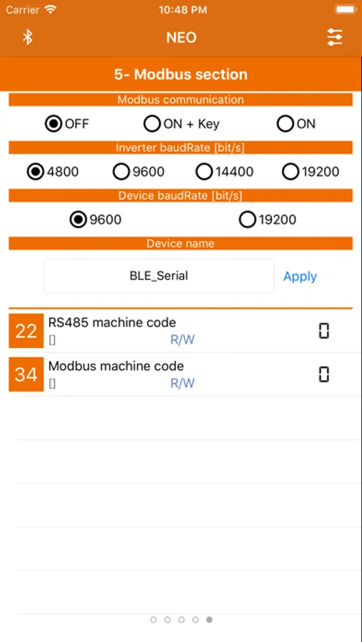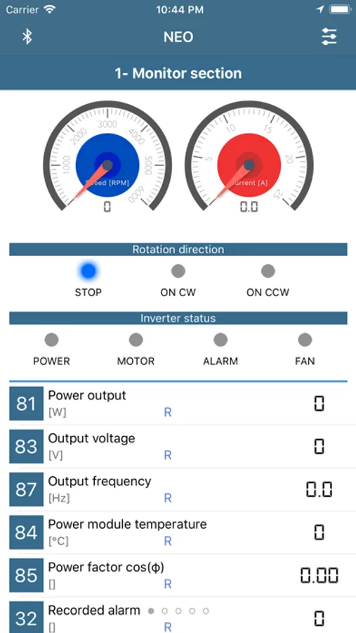 Motive NEO comands the NEO-WiFi inverter series via bluetooth low energy. It is possible to write parameters and send comands by using the BLUE BLE2Serial converter.