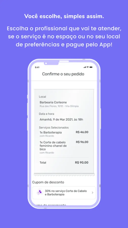 E não acaba por aí: Quer dar um tapa no visual, repaginar o corte de cabelo com aquela cabeleireira top, alinhar a barba, ou marcar aquela massagem no conforto da sua casa? Sem problemas! Com o nosso delivery de serviços de beleza e bem-estar, você pode escolher o profissional do seu salão favorito, ou daquele que você quer conhecer, agenda um horário, faz o pagamento, e ele vai até você! Mas não se preocupe: Tudo é feito com muito cuidado e segurança pelo estabelecimento escolhido.