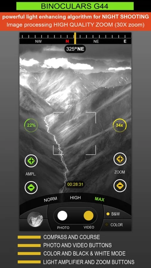 The best super digital video zoom app with Night mode. The application takes real pictures and videos at the lowest luminosity without any additional appliances on iPhone. Maximal Amplification Mode - culmination of our Research and Development team, utilises a breakthrough technology, pushing all the computing and hardware abilities of your phone to the limit, thus producing an outstanding effect. The application works without any delays and lags. During the photo/video recording you can dynamically change camera sensitivity to achieve the best result as well as set any 1-30x zoom simultaneous to the recoding. The application has own library to organise photos and videos, and share them on the Facebook, DropBox and Twitter.