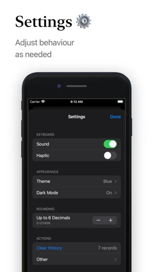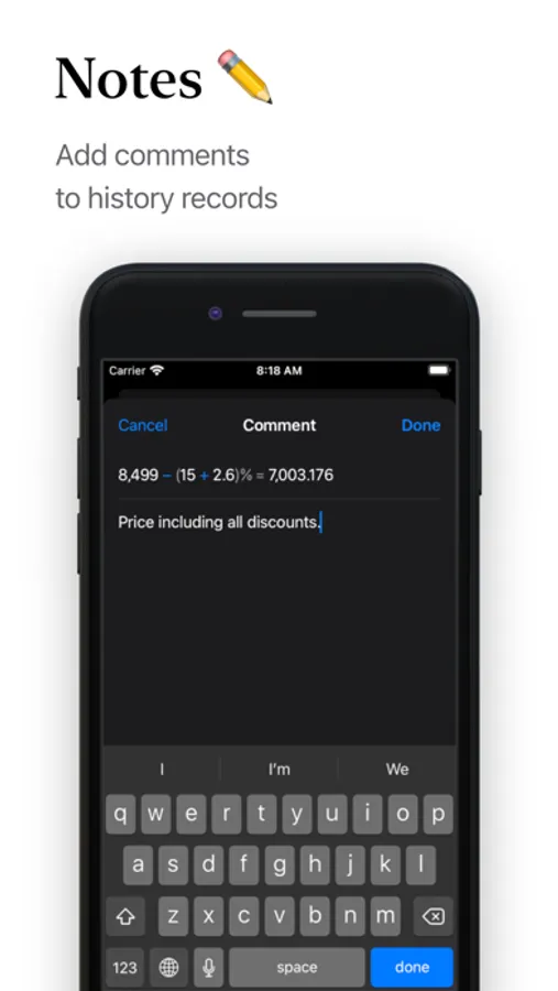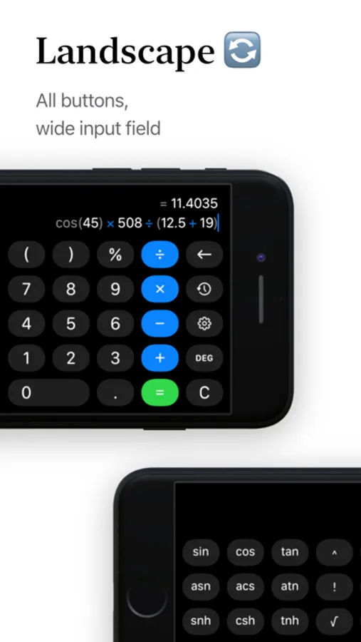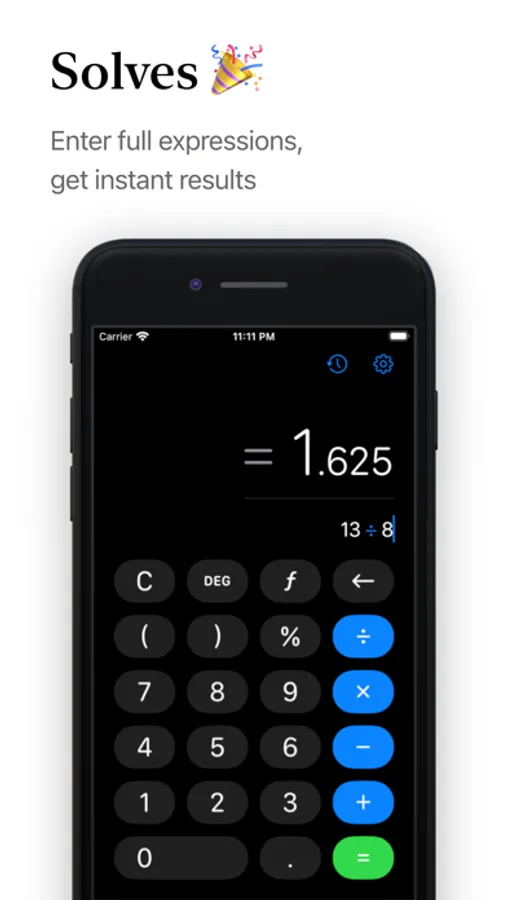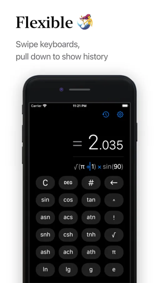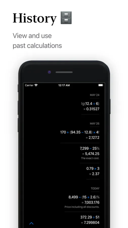 Calculator with percentages, powers and functions. History with comments that is synced across all your devices. Cursor for editing anywhere. Simple interface with dark and light themes.
