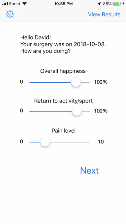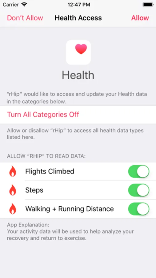 This app integrates with the HealthKit app to retrieve activity data, and uses this data to track patient activity levels and recovery.