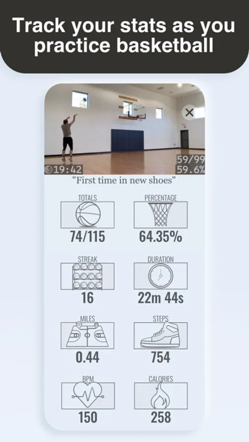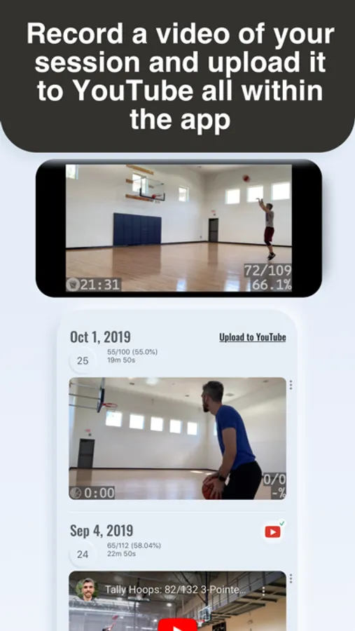 Record a video of your session from within Tally Hoops and it will automatically add an overlay showing your shot totals and percentage.
