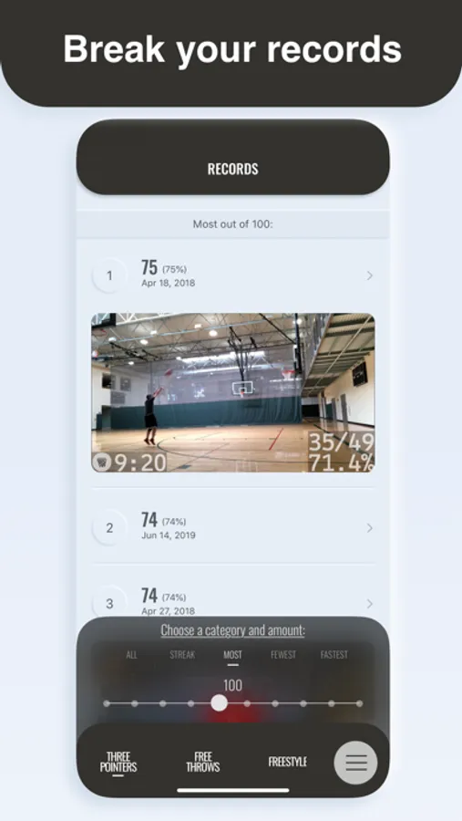 Find out what your personal records are such as most free throws out of 100 or most three pointers made in a row.