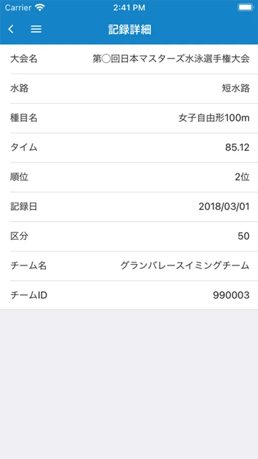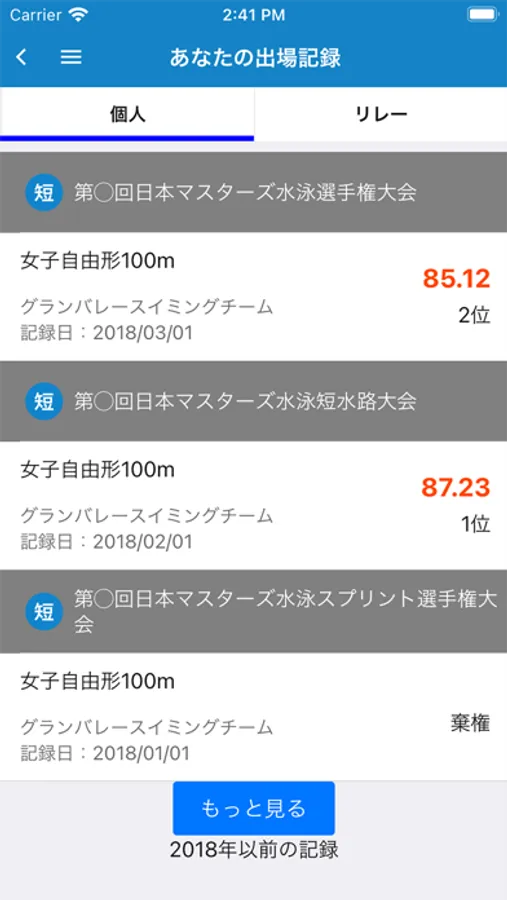 ・過去に出場した競技会の種目ごとの自己記録出のタイム表示機能があります。