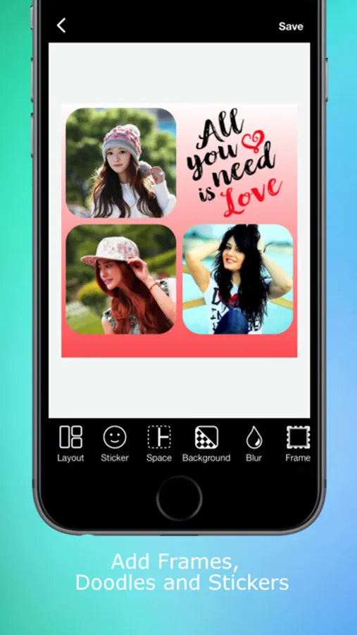 Collages Editor Camera allow you to add text, stickers to your collaged photos.