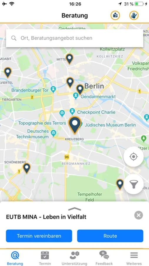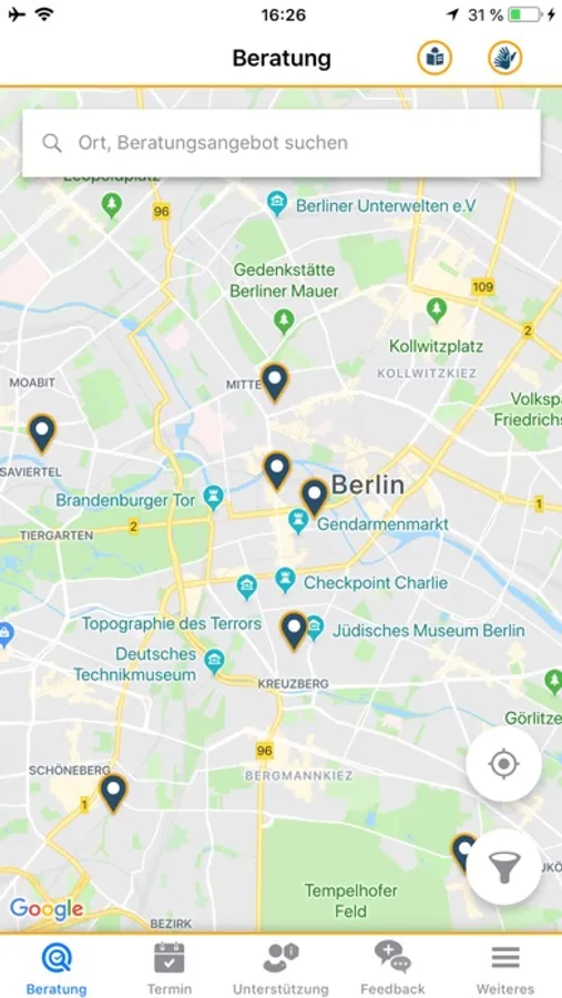 1) schnell und unkompliziert ein Beratungsangebot in Ihrer Nähe finden (dafür verwenden Sie den Bereich „Beratung“),
