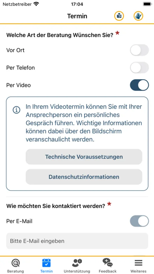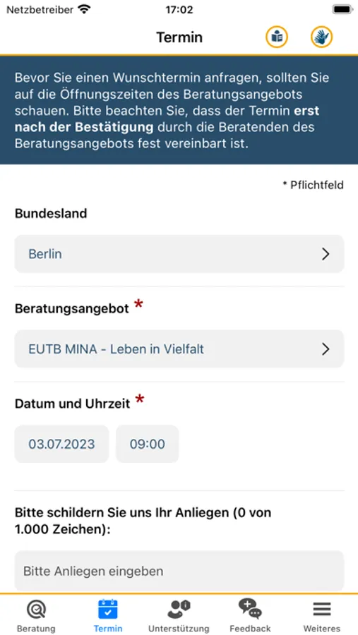 2) einen Wunschtermin bei einem Beratungsangebot anfragen (dafür verwenden Sie den Bereich „Termin“),