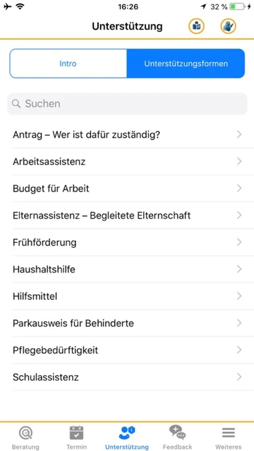 3) sich über die zur Verfügung stehenden Unterstützungsformen informieren (dafür verwenden Sie den Bereich „Unterstützung“),