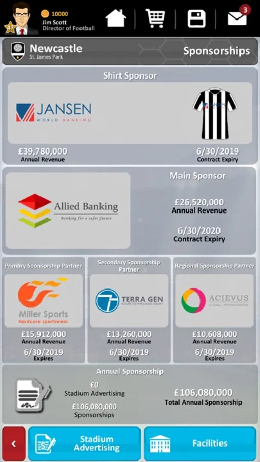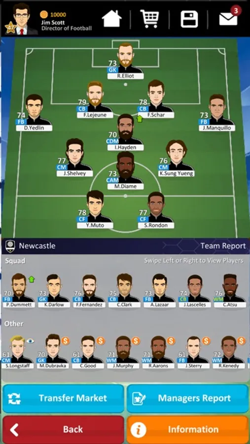 Manage every aspect of your club’s development and how you invest funds. Develop and upgrade your club's facilities, including the stadium, training ground and youth Academy. Increase revenues by negotiating sponsorships. Hire and fire your management team and build your dream squad by negotiating transfers and offers with player agents as well as handling contract negotiations with players and staff alike.