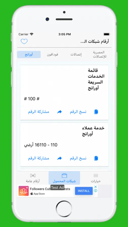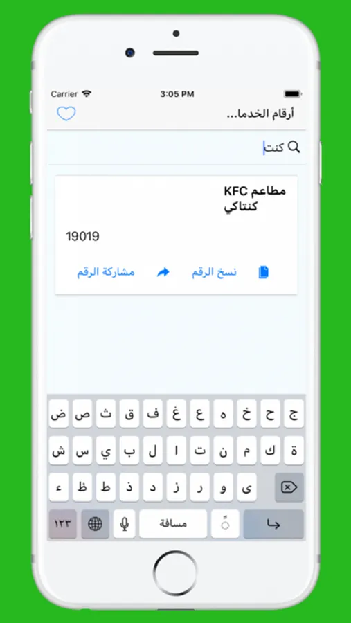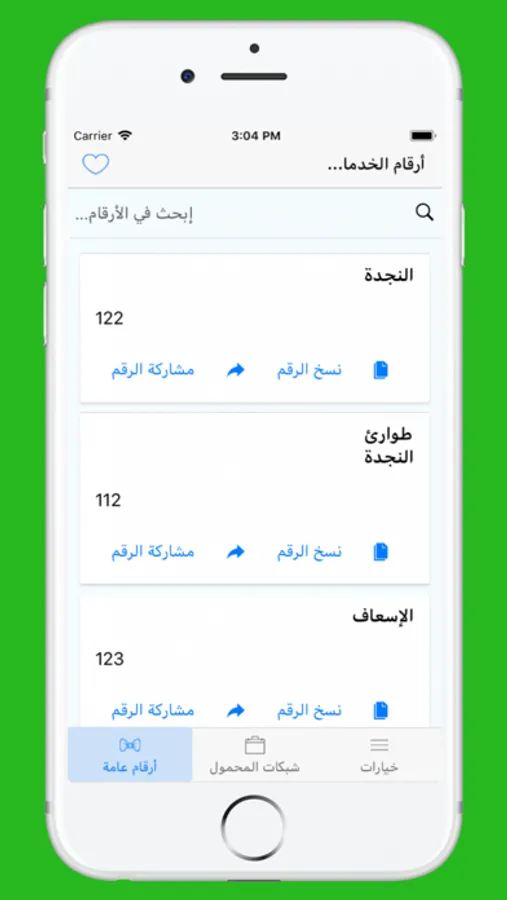 التطبيق به معظم أرقام الخدمات العامة وخدمات شركات المحمول لتستطيع الوصول لها بسهولة. ويمكنك مشاركة هذه الأرقام مع أصدقائك بسهولة على وسائل التواصل الإجتماعي.