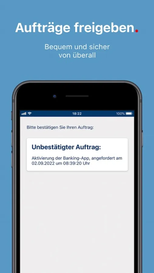 Wartet eine Online-Transaktion auf Freigabe, erhalten Sie über die 1822TAN+ App eine Push-Nachricht auf Ihr Smartphone. In der 1822TAN+ App können Sie den Auftrag dann bestätigen oder abbrechen.