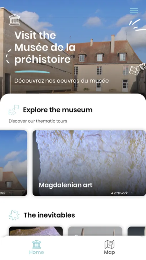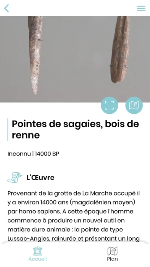 Conçue par les équipes du Musée de la Préhistoire en partenariat avec des étudiants et enseignants de l’Université de La Rochelle et avec le soutien de la DRAC Nouvelle-Aquitaine, cette application offre un menu intuitif très simple d’utilisation, à la portée de tous. À partir du menu, le visiteur navigue sur différents onglets.