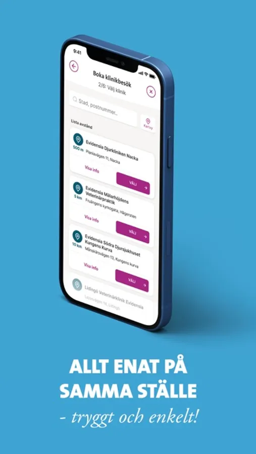 With the Evidensia app, you can easily book veterinary appointments at our practices and video consultations with one of our veterinarians on your mobile phone or tablet. You choose the appointment time and type that suits you and your pet best. If you have visited us before, we will have all the information about you and your pet. You can also add your pets directly in the app. You easily log in with your Swedish Bank-ID to get access to our services.