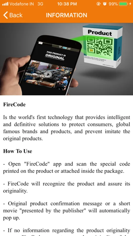 2- FireCode will recognize the product and confirm its authenticity, through a confirmation message or a short film or a picture or guidance about the product (it will appear automatically).
