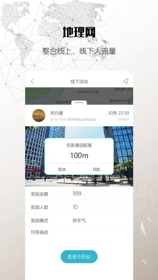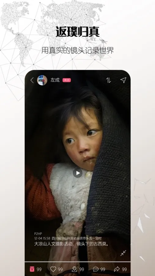 利用手机定位功能,将地理位置与地图坐标整合在一起。通过手机拍摄发布视频即可钉在对应的地图坐标上,将线上和线下更直观高效的联系在一起。