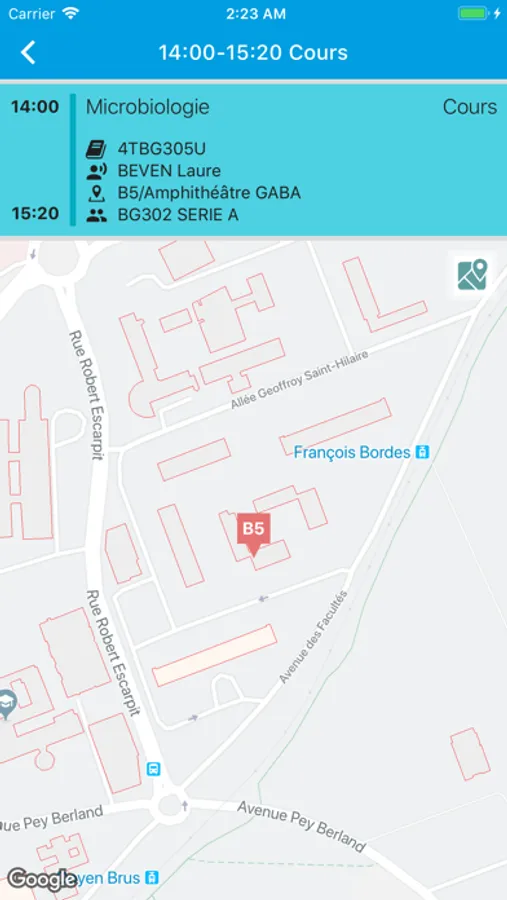 Les emplois du temps sont visuables de manière quotidienne ou hebdomadaire. Et pour les bâtiments répertoriés, l'application te propose une géolocalisation pour ne plus te perdre sur le campus !