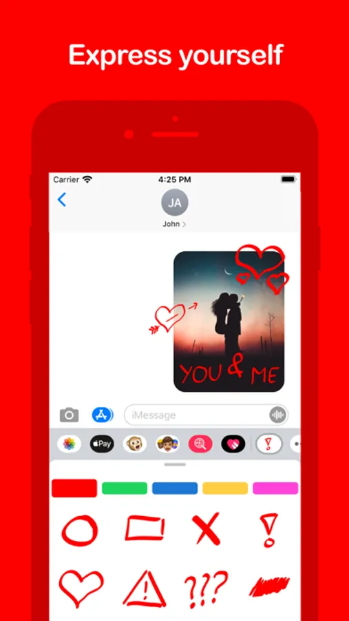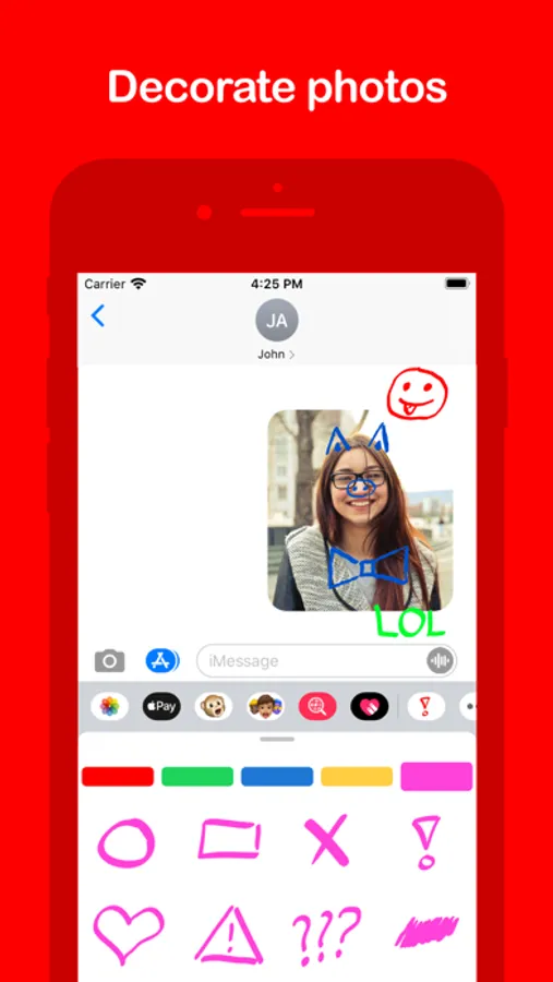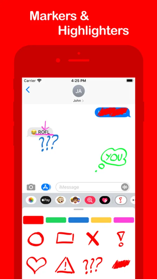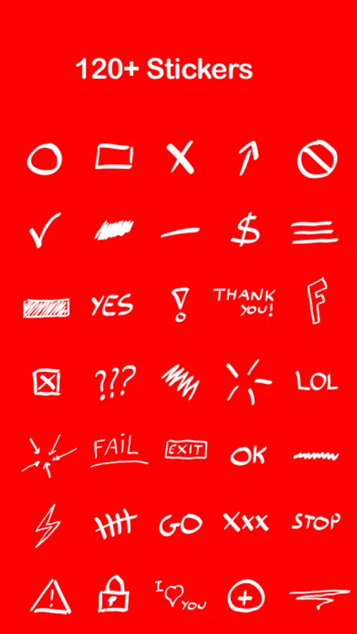 Over 120 marker and highlighter stickers in different colors. These stickers are great for everyday use in a conversation. Point out spelling mistakes, decorate a photo, express your love, emphasise a message, add quick reactions, hide a message and so on.