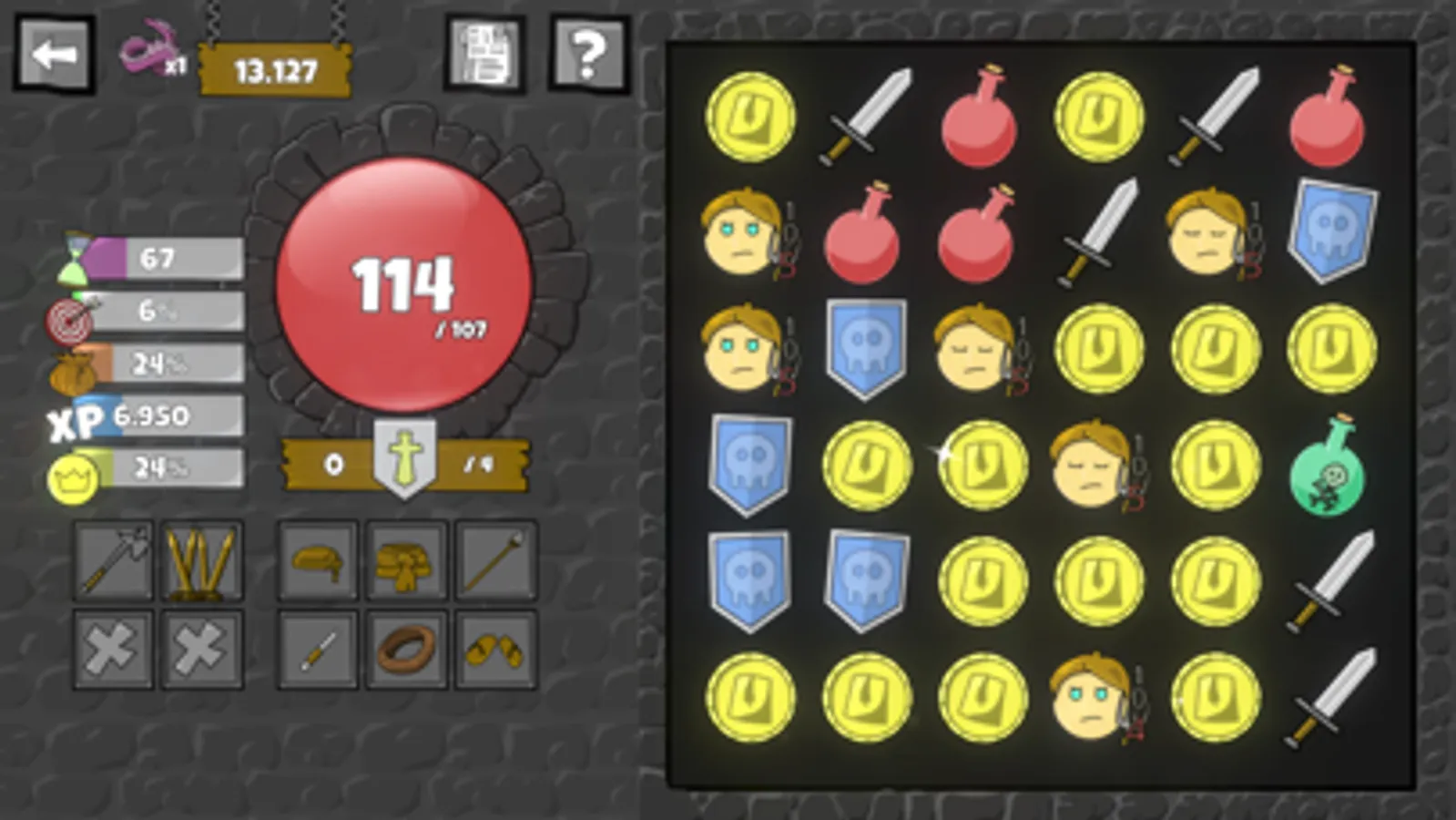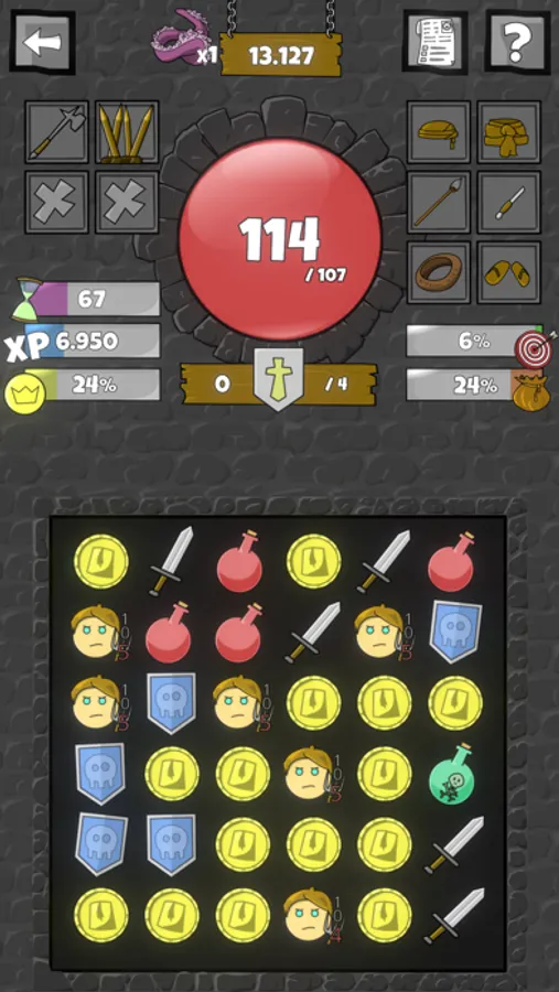 More and more enemies pour through the broken door and by connecting them to sword tiles you can fight them off. Once you get hit you can connect potions to heal your wounds or connect shields to improve your armor. Connecting gold might lead to new treasures that help you defend what is yours and keep their filthy hands of your stuff.