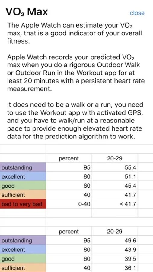 The Apple Watch can estimate your VO₂ max and records the predicted VO₂ maximum if you take a brisk hike, walk or run outdoors with a continuous heart rate measurement in the Workout app for at least 20 minutes.