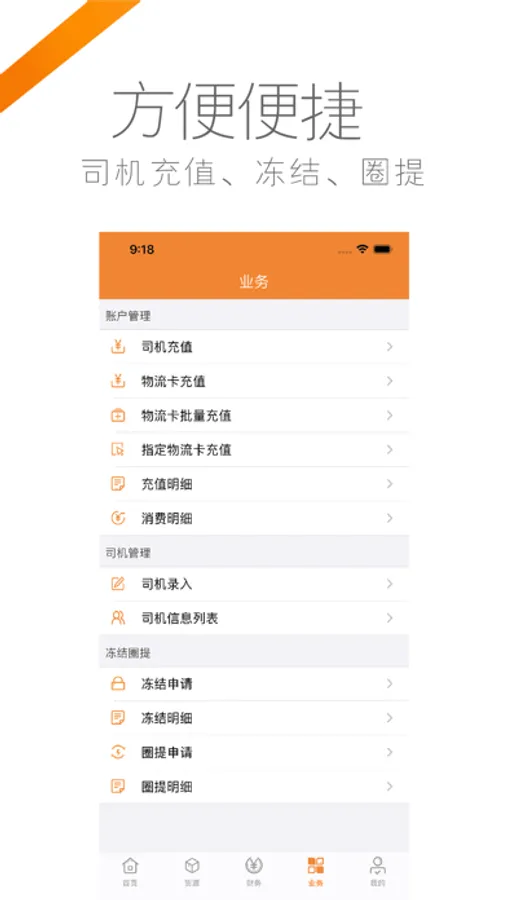 物流企业可通过手机APP一键充值打款,管理公司的司机充值/录入/冻结等资金业务,同时可查看公司账户流水,提货卡,发票等日常工作业务管理