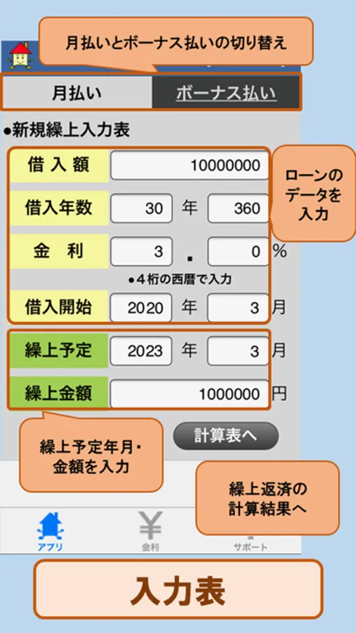 上部のタブで月払いとボーナス払いの切り替えが可能です。