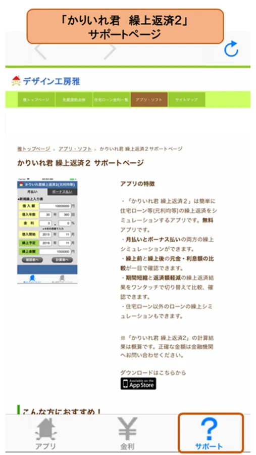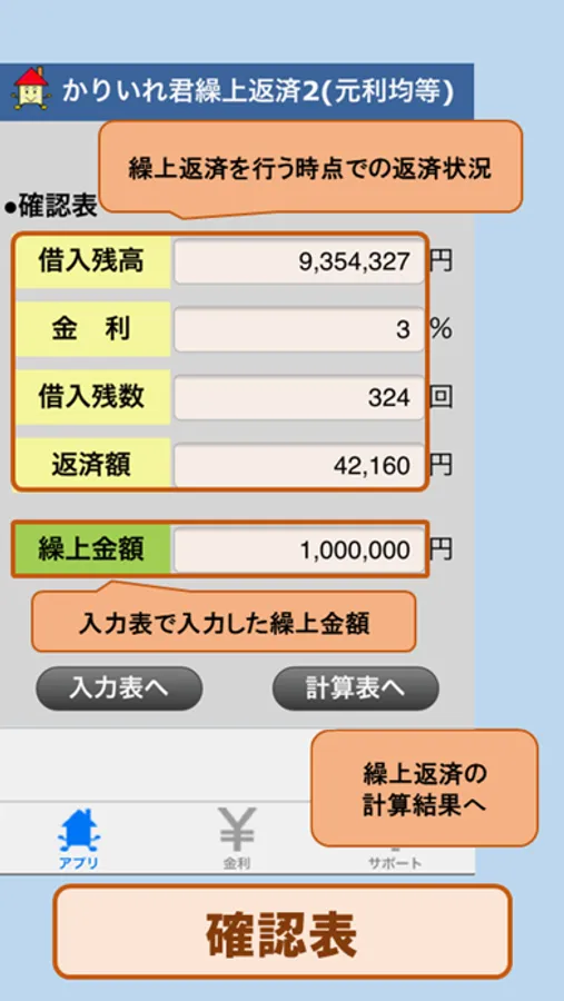 「かりいれ君 繰上返済2」は住宅ローン等(元利均等)の繰上返済をシミュレーションするアプリです。シンプルな画面で簡単に繰上返済の効果を確認できます。