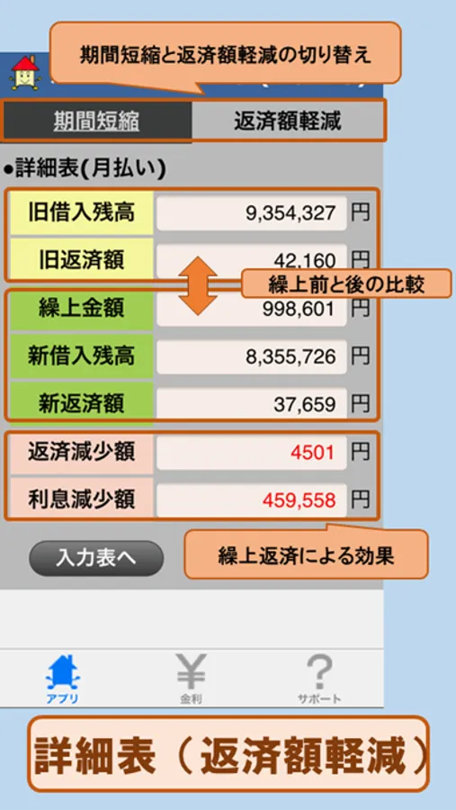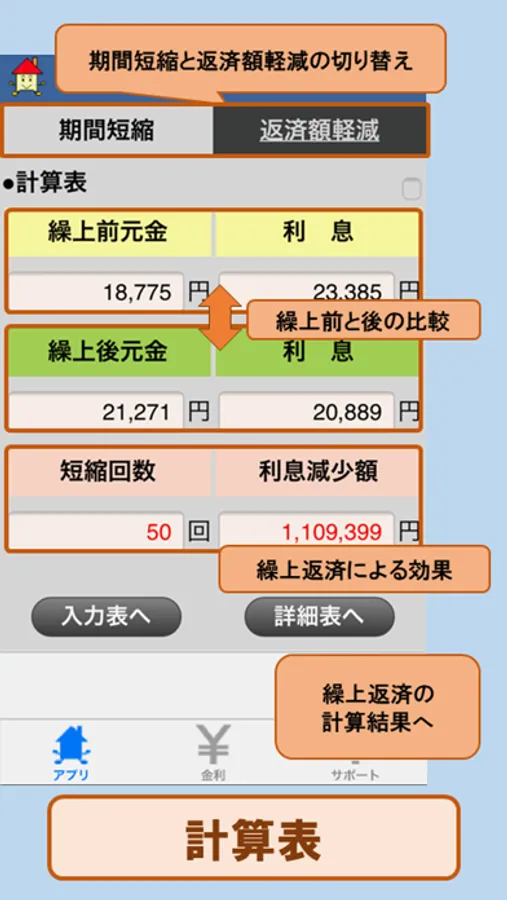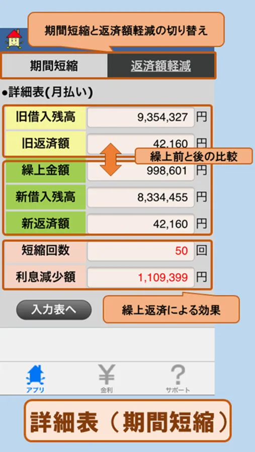 期間短縮と返済額軽減の繰上返済結果をワンタッチで切り替えて比較、確認ができます。