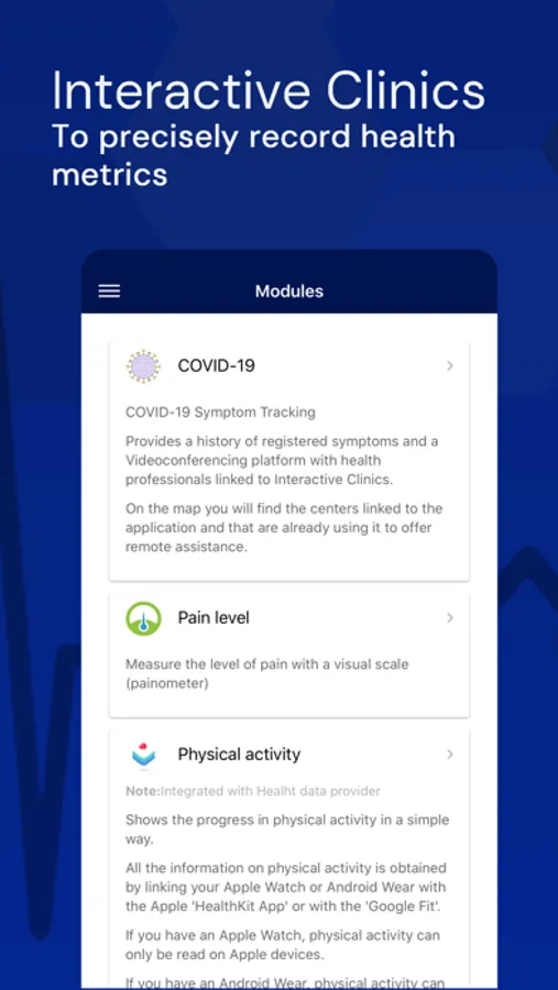 The "Interactive Clinics" application allows you to precisely record multiple metrics and health data through a SmartPhone or tablet.