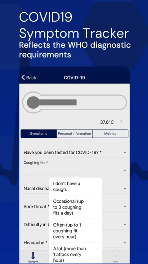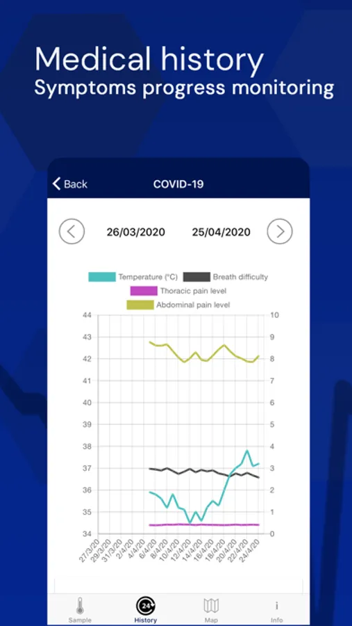 • Monitoring of the patient's temperature, questionnaire to monitor the evolution of the disease such as respiratory problems, level of chest pain, abdominal pain, among others. The module has been developed in collaboration with high-level international doctors, researchers and academics. Reflects the diagnostic requirements described by the WHO (World Health Organization)
