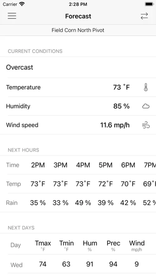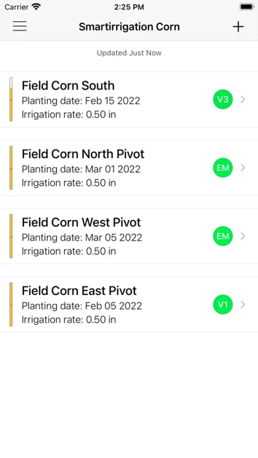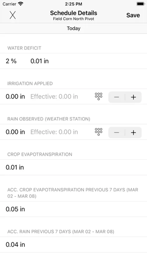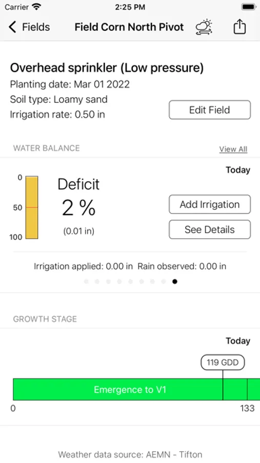 Users can register multiple fields. The app tracks available soil moisture in all registered fields and sends push notifications when irrigation is recommended or when the crop is approaching a new growth stage. Irrigation recommendations for Variable Rate Irrigation Systems can be achieved by registering each irrigation zone within a field as a different field.