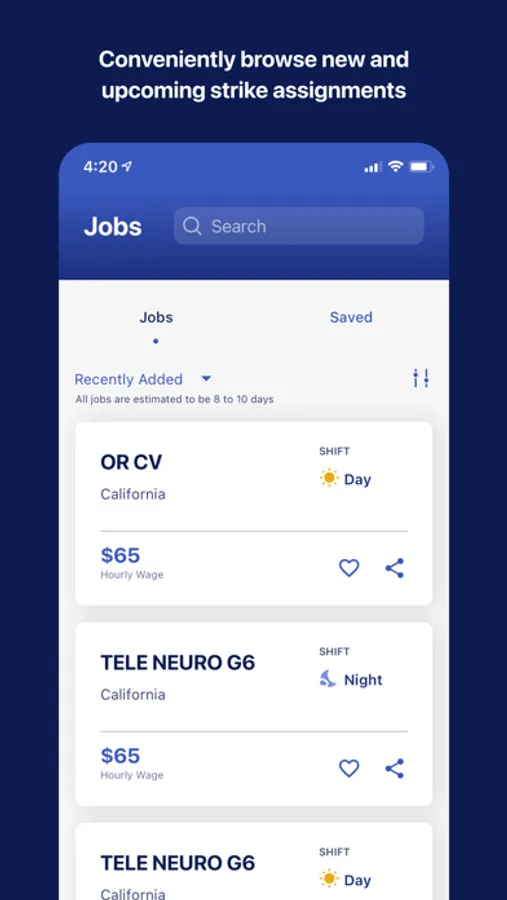 We're revolutionizing the strike nurse assignment process. For the first time ever, not only browse upcoming or active strike assignments, but apply directly through the app. Plus, keep your profile and required documents up to date so you're ready in a moment's notice.