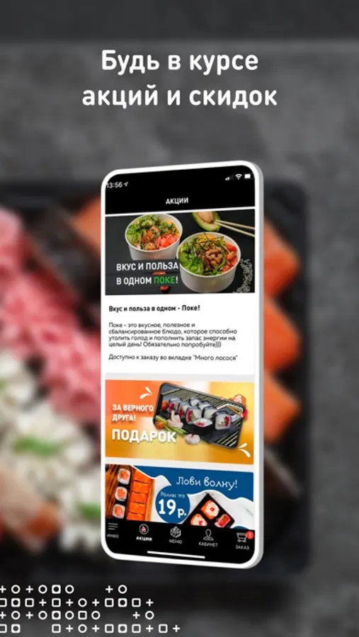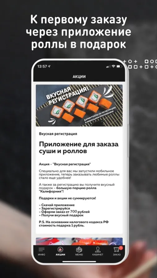 Захотелось вкуснейших суши и роллов? Тогда вы по адресу. В нашем приложении Вы можете заказать суши недорого и быстро, а еще Вас ожидает множество приятных "фишек"! В нашем меню Вы всегда найдете актуальные цены и товары. Доставка роллов осуществляется исключительно во время и по указанному вами адресу.