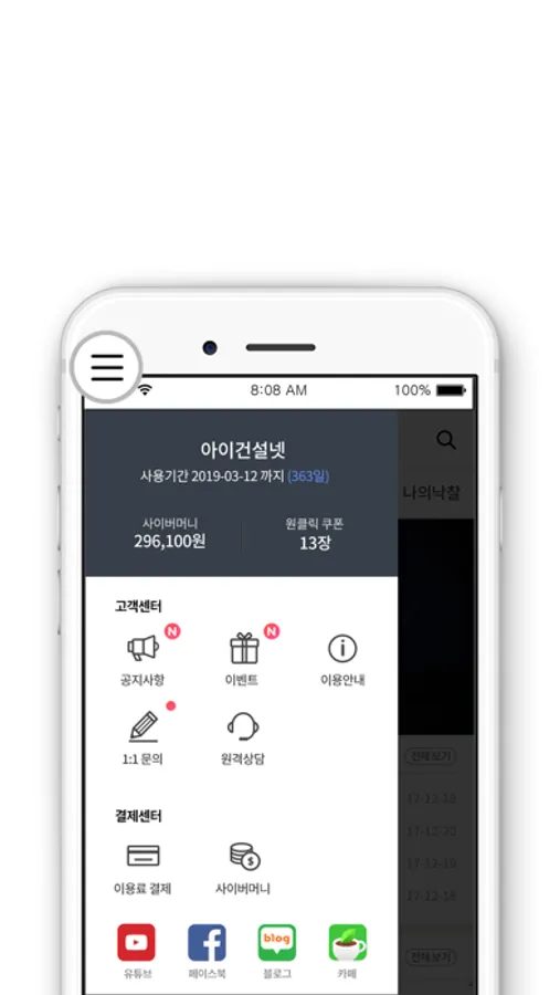 삼선 메뉴(三)를 통해 고객센터, 결제센터, 앱 설정, 로그아웃 등의 서비스를 한 곳에서 이용할 수 있습니다.