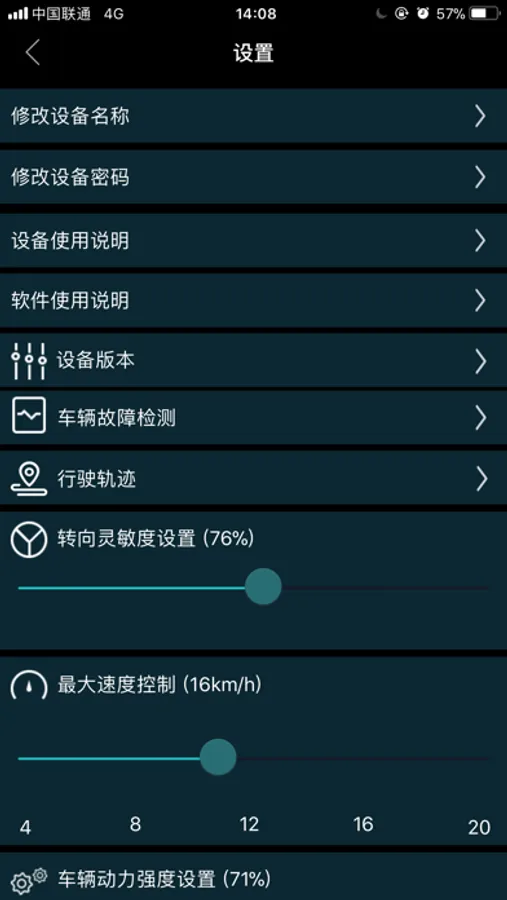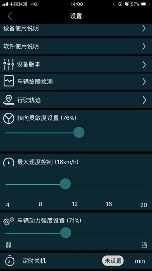 在设置中还可以实现平衡车的转向灵敏度,动力调整,和定时关机。
