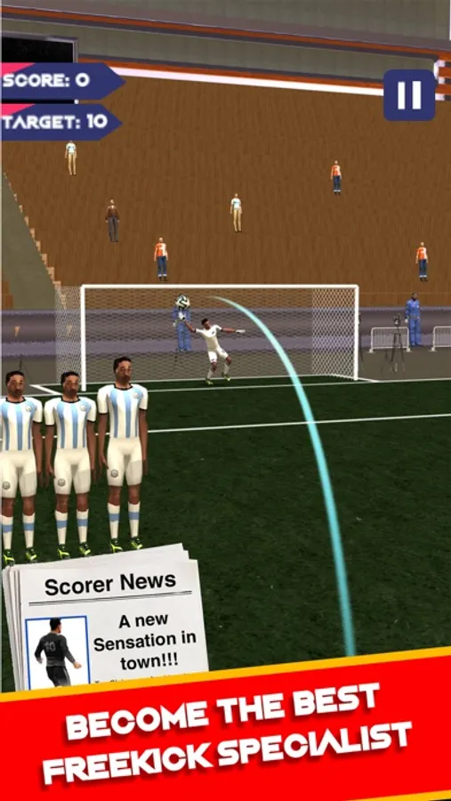 Score Free Kicks from different Positions, Narrow Angles and through Player Walls. Make it a real challenge for you to score against a Pro Goal Keeper.