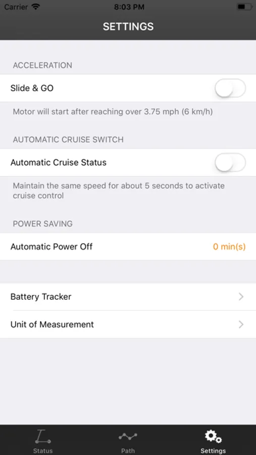 Customize things your way by toggling or turning on a number of features like automatic acceleration, Cruise Control, and Safety Look. Cruise through town, lock down your wheels for scooter transport, and so much more. Keep an eye on status, map out your paths, and even track your time to record how long you’ve been out and about!