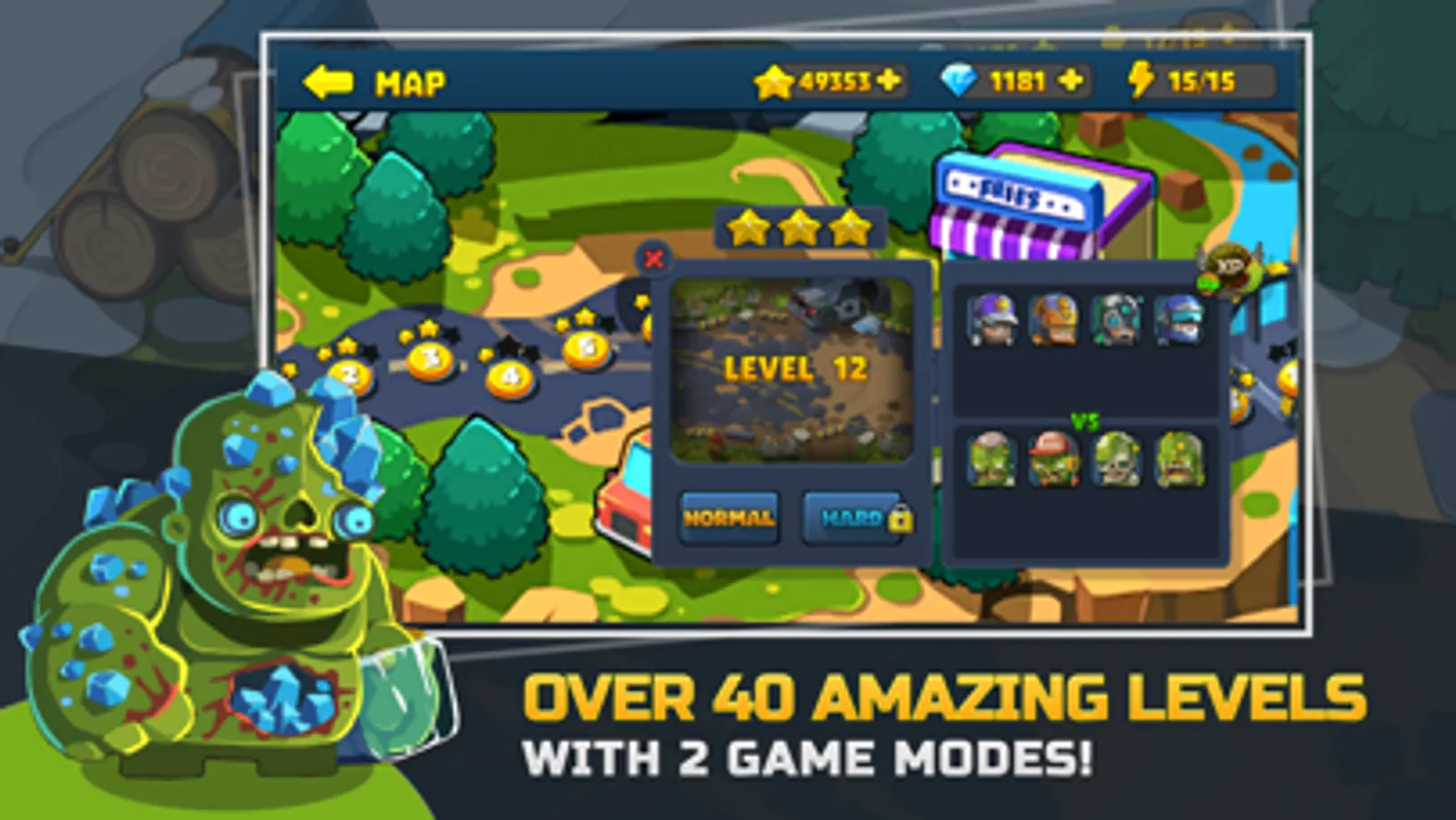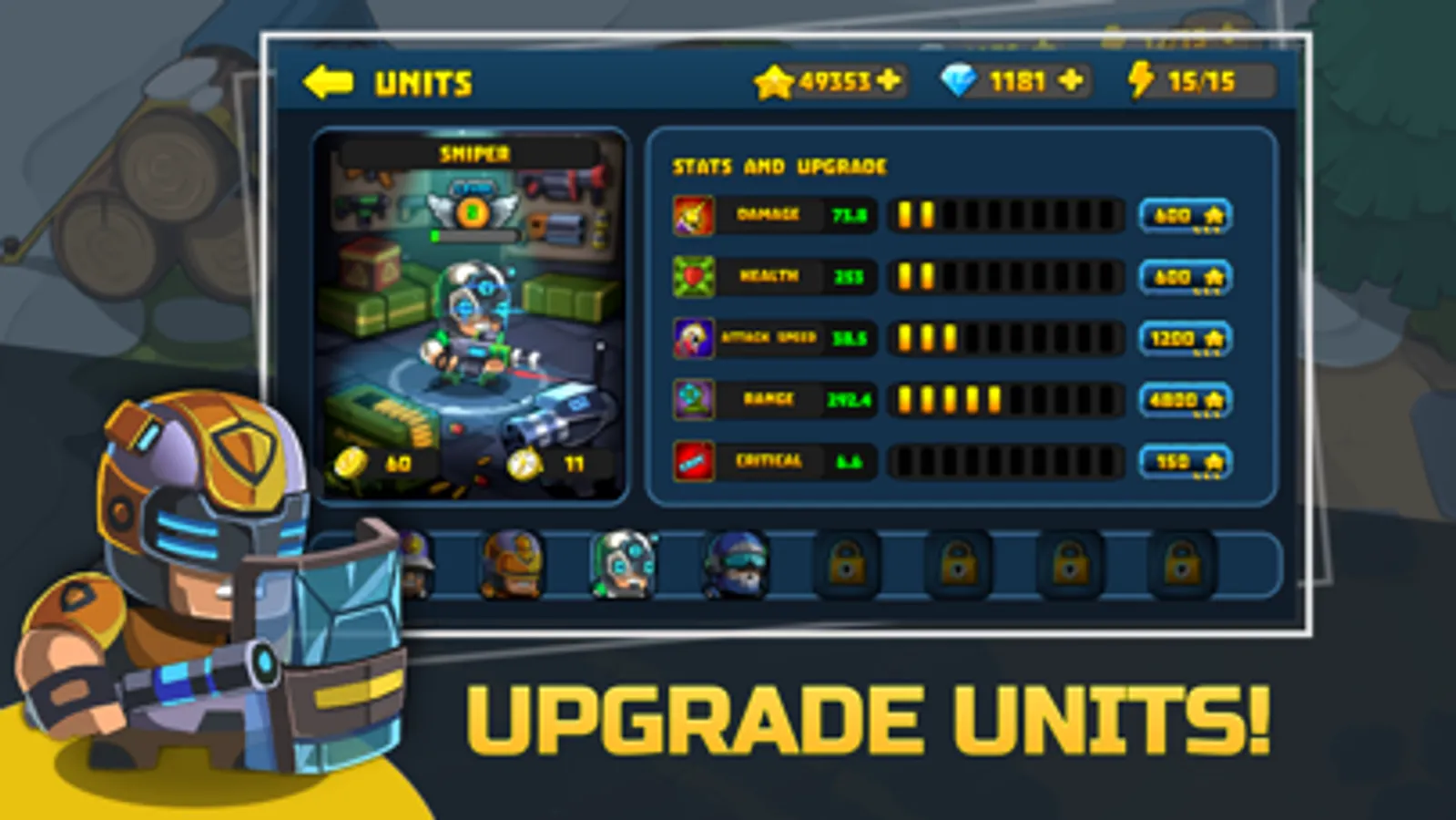You have 8 kinds of soldiers who can shoot all zombies. Double pistol, Electric, Fireman, Gatling Gun, Mr Rocket, Shotgun or Sniper - choose whatever you want and destroy them all to save the world. When you will earn enough money just upgrade your units to make them much stronger!