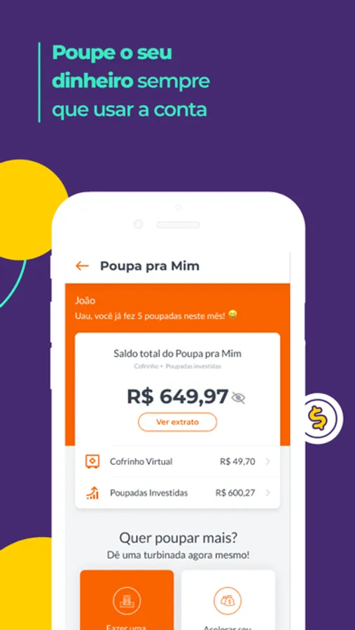 Pague contas, confira saldo e extrato, consulte as faturas do cartão, faça depósito por boleto, realize investimentos, empréstimos, faça TED gratuitos, use o pix e muito mais!