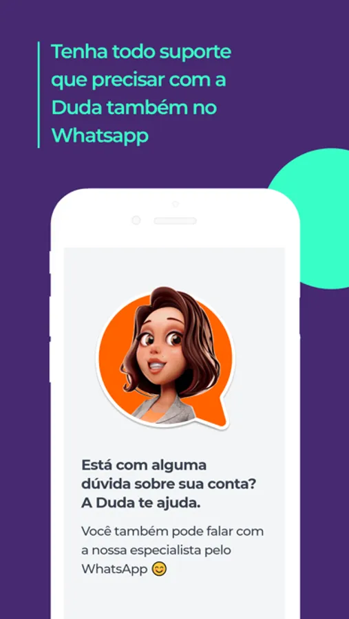 Dúvidas sobre o app ou sobre serviços? Fale com a Duda, a assistente virtual que te ouve de verdade, pelo aplicativo de mensagem!