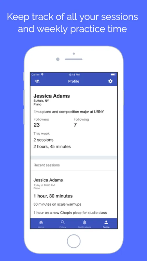 * Create a musician profile with a short bio, your weekly practice time, and all your practice sessions.