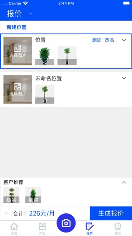 根据即时环境模拟的设计图,一键生成植物及花盆组合报价表,快速分享。