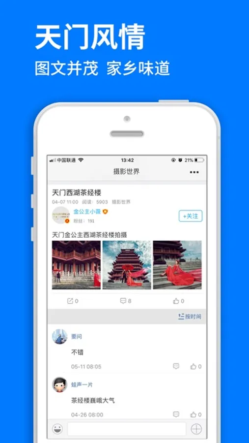 大天门网,湖北天门领先的人气社区,是聚焦天门发展,天门户外、文学、摄影等爱好者交流,招聘求职房产租售信息发布的优秀平台。大天门APP的推出,将为广大网友浏览和发布内容提供更强大更便捷的方式,而强大的粉丝系统一定能让你的成就感爆棚!
