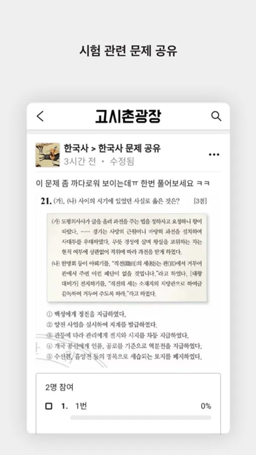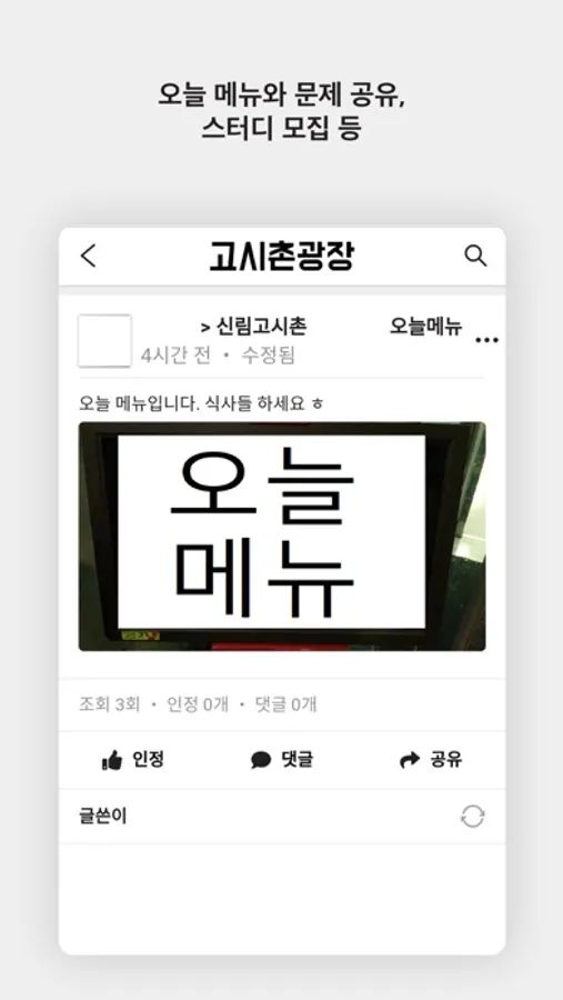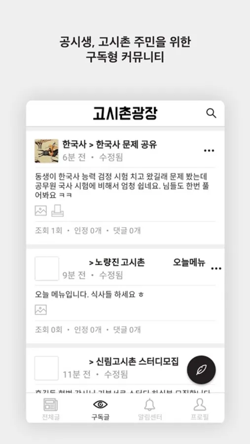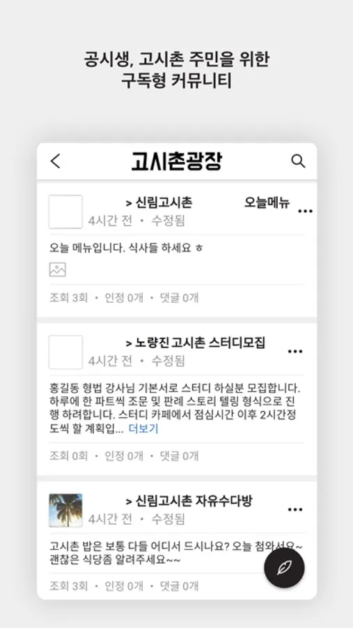 주요 고시촌(신림, 노량진 등)의 공무원 시험 준비생이나 인근 주민, 현직의 공무원들을 위한 구독형 전국 커뮤니티, 정보 앱입니다. 인근 고시식당의 오늘 메뉴나 스터디 모집, 시험 정보 공유, 문제 공유, 현직 공무원 과의 대화, 구인구직 등의 카테고리로 운영됩니다.